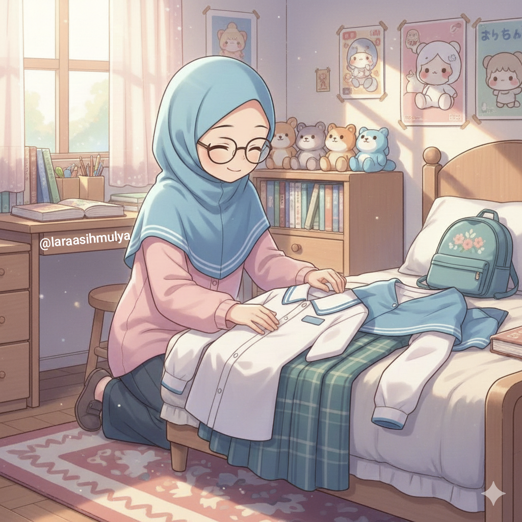 Siapkan seragam jauh-jauh hari. Usahakan anak-anak yang menata sendiri. Biar tau segala perintilannya. Meminimalisir, “Bunda kaos kaki mana, ikat pinggang, bla bla bla.”