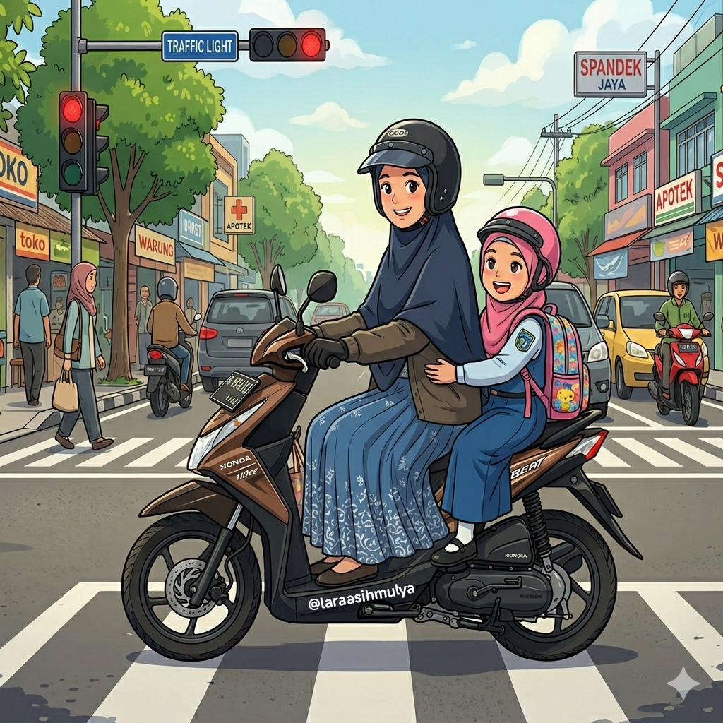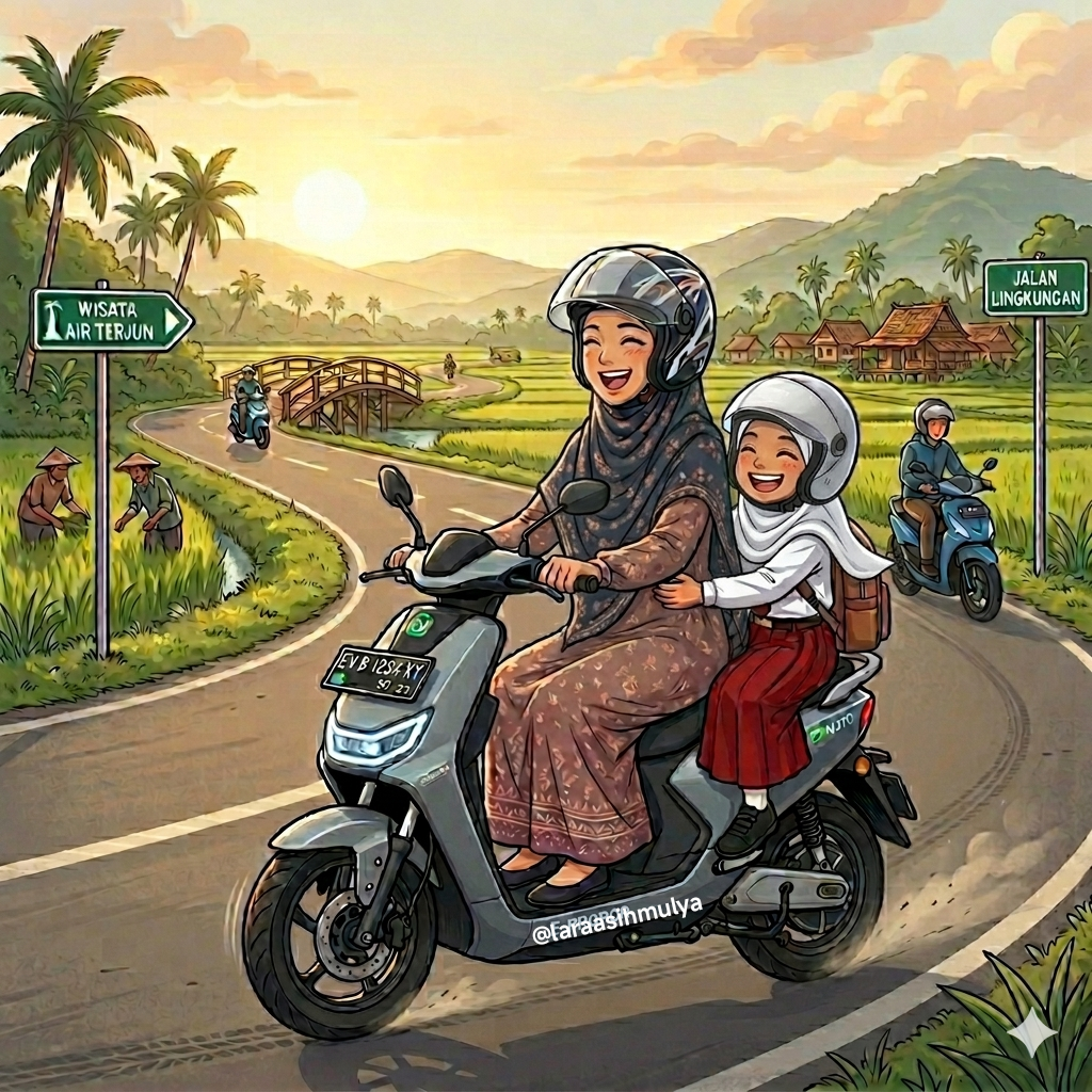 Coba bayangin, tinggi badan yang cuma 150cm ini dengan santai menikmati golden hour. π Bonceng anak dengan nyaman. Sampai sekolah tepat dan aman. π